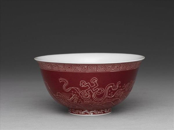 小碗,敞口,深壁,平底,圈足。器內壁施釉素潔,白地彩繪折枝花卉。外壁施紅彩,反白剔劃裝飾;露出白釉各式圖案:口沿下一道回紋,器身海水江牙紋上繪卍字和山石紋樣。足壁卷葉紋,底留一道白色絃紋。底以青花雙方框書「乾隆年製」兩行楷款。