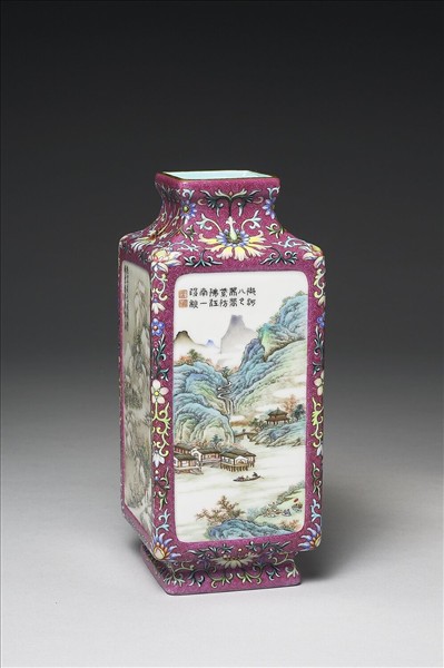 長方瓶,瓶身四面開光外,餘隙均作紫紅地錦上添花洋花紋飾,洋花有洋蓮及洋菊等。四開光內各繪春夏秋冬四景山水,春景明媚繪御園殿宇春景,夏景蒼翠亦為御園,秋景瀑布山景,冬景繪冰天雪地裡一拄杖紅衣文士攜僮,渡橋而來。口沿描金,底部及內頸施湖綠釉,底心留白框內青花書「大清乾隆年製」六字三行篆款。