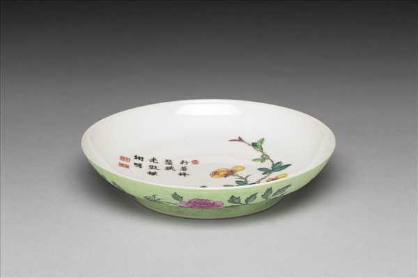 敞口,淺弧壁,平底,矮圈足。碟心白地上各以琺瑯彩繪黃薔薇及石竹,上墨書題句:「粉著蜂鬚膩,光凝蝶翅明」,上下朱紅鈐印「佳麗」、「金成、「旭映」三印。外壁淺綠地上錐剔六方形錦花紋,餘隙畫折枝牡丹、荷花、菊花、紅梅等四季花卉,口足留白一道。胎薄透光,底藍料書「乾隆年製」四字二行仿宋體楷款,外加雙方框。