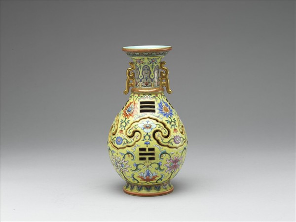 此件作品構造相當複雜,不僅同時匯集轉心、套瓶及交泰的技法於一器,而且紋飾的處理亦包含彩繪與鏤空的兩種技法。從外觀看來,該瓶作一侈口、寬唇、短頸、碩腹、矮圈足的造形,然而仔細研究其結構,發現整隻瓶子其實可以拆解成瓶頸、腹部及內、外兩瓶,形成「交泰」的瓶式。整件作品無論內與外,相接組的部分皆分別分開燒造之後再拼接成一件整器。以手觸動瓶頸,內瓶亦隨之旋轉,而瓶腹雖一分為二,然而藉由內瓶的套接,上下兩部分既相錯開,也彼此維持著巧妙的套合關係,有象徵天地上下交通,國泰民安之意,故稱為「交泰瓶」。瓶面施黃釉,釉面以針刻繪出纖細的錦地花紋,花紋之上再以藍、白、紫、粉綠、深綠、橘紅等釉彩描畫番蓮花、蕉葉和朵花,花朵的形狀雖然一樣,但在不同釉彩的裝飾下,顯得錯落有致。最難能可貴的是每一朵花、每一片葉的筋脈皆巨細靡遺地描繪出來,而敷染的色澤亦有深淺濃淡的變化。同時,鏤空的八卦紋及上下分開的如意雲紋,亦能將觀者的視線指引至內瓶,強調該瓶穿透玲瓏的特色。「夾層玲瓏交泰瓶」為督陶官唐英及其助理老格精心研發燒造的新品類,故於奏摺中特別請皇帝「教導改正」。之後,御窯廠也持續生產轉心瓶、夾層套瓶以及交泰瓶等高難度的作品,說明乾隆官窯的確十分熱衷於技術層面的開發與追求。