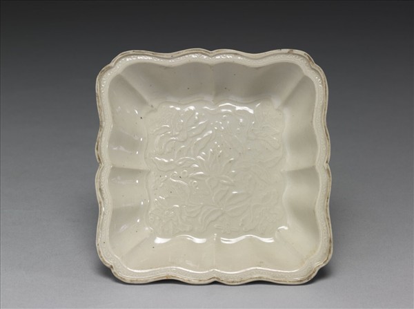 方碟造形仿自金銀器,口沿作方菱形,邊緣凸起一道細稜,面劃卷草紋。碟心淺印荷花水草,底呼應口沿亦凸起一周方菱細邊。底心因胎土不純而局部凸起顆粒狀的小點,通體施灰白色釉,光澤較弱。此品與 汝窯橢圓小洗(故瓷17849)一樣,曾經清高宗乾隆皇帝的收藏,被收錄於《延埴流光》圖冊中。