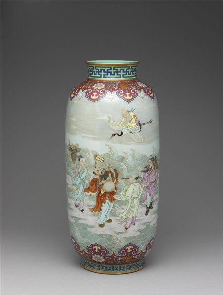 侈口窄唇,短頸,腹部豐長,矮圈足。胎骨較厚,瓶面彩畫八仙慶壽圖,隙地滿畫波濤紋。口足間分畫萬字紋、如意雲及花卉各一層,並描金邊。器內及底均施翠綠色釉。底均有硃紅書「大清乾隆年製」六篆字款。