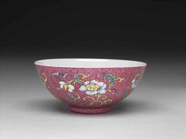 敞口,弧壁,矮圈足。內底為白地,繪兩折枝桃實、一佛手與兩石榴,其中一顆石榴露出內部飽滿的種籽。外壁紫紅地上錐剔卷草紋,口沿處留白一周,隙地加飾彩繪折枝花四朵,枝葉捲曲盤繞於四周,花朵朝向正前方,其左側皆連接另一朵小花,只可見到其側面。器底為白地,以青花書「大清乾隆年製」六字三行篆款,青花色澤淺淡。於錦地隙處繪飾花紋之技法又稱為「錦上添花」,為乾隆朝琺瑯彩瓷常見之技法。