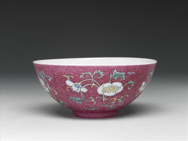 敞口,弧壁,矮圈足。內底為白地,繪兩折枝桃實、一佛手與兩石榴,其中一顆石榴露出內部飽滿的種籽。外壁紫紅地上錐剔卷草紋,口沿處留白一周,隙地加飾彩繪折枝花四朵,枝葉捲曲盤繞於四周,花朵朝向正前方,其左側皆連接另一朵小花,只可見到其側面。器底為白地,以青花書「大清乾隆年製」六字三行篆款,青花色澤淺淡。於錦地隙處繪飾花紋之技法又稱為「錦上添花」,為乾隆朝琺瑯彩瓷常見之技法。