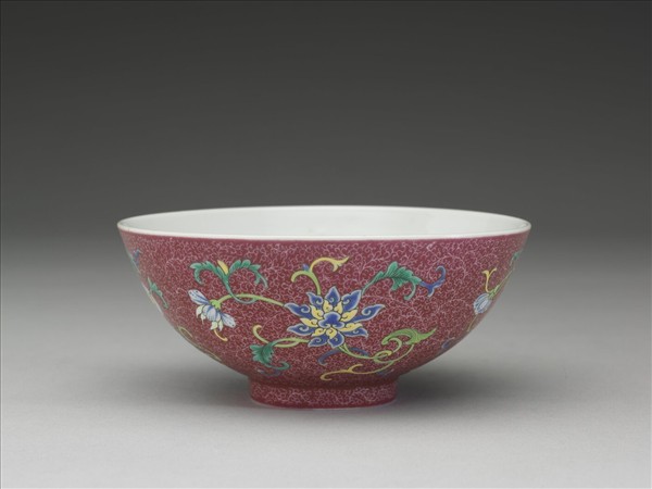 敞口,弧壁,矮圈足。內底為白地,繪兩折枝桃實、一佛手與兩石榴,其中一顆石榴露出內部飽滿的種籽。外壁紫紅地上錐剔卷草紋,口沿處留白一周,隙地加飾彩繪折枝花四朵,枝葉捲曲盤繞於四周,花朵朝向正前方,其左側皆連接另一朵小花,只可見到其側面。器底為白地,以青花書「大清乾隆年製」六字三行篆款,青花色澤淺淡。於錦地隙處繪飾花紋之技法又稱為「錦上添花」,為乾隆朝琺瑯彩瓷常見之技法。