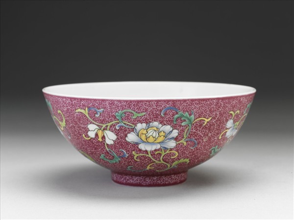 敞口,弧壁,矮圈足。內底為白地,繪兩折枝桃實、一佛手與兩石榴,其中一顆石榴露出內部飽滿的種籽。外壁紫紅地上錐剔卷草紋,口沿處留白一周,隙地加飾彩繪折枝花四朵,枝葉捲曲盤繞於四周,花朵朝向正前方,其左側皆連接另一朵小花,只可見到其側面。器底為白地,以青花書「大清乾隆年製」六字三行篆款,青花色澤淺淡。於錦地隙處繪飾花紋之技法又稱為「錦上添花」,為乾隆朝琺瑯彩瓷常見之技法。