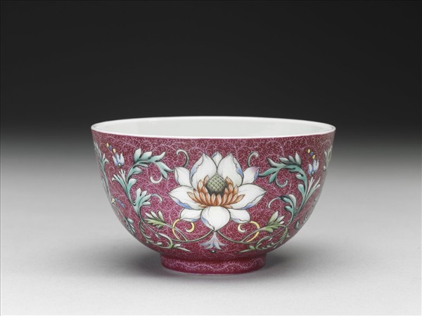 敞口,弧壁,矮圈足。器內壁為白地,光素無紋,外壁紫紅地上錐剔卷草紋,口沿與足底留白一周,隙地加飾彩繪折枝洋花三朵,兩側飾對稱綠葉,枝葉捲曲柔軟,錯落有致。器底為白地,以青花書「大清乾隆年製」六字三行篆款,青花色澤淺淡。於錦地隙處繪飾花紋之技法又稱為「錦上添花」,為乾隆朝琺瑯彩瓷常見之技法。