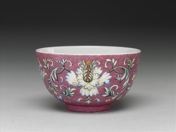 敞口,弧壁,矮圈足。器內壁為白地,光素無紋,外壁紫紅地上錐剔卷草紋,口沿與足底留白一周,隙地加飾彩繪折枝洋花三朵,兩側飾對稱綠葉,枝葉捲曲柔軟,錯落有致。器底為白地,以青花書「大清乾隆年製」六字三行篆款,青花色澤淺淡。於錦地隙處繪飾花紋之技法又稱為「錦上添花」,為乾隆朝琺瑯彩瓷常見之技法。