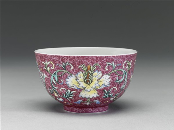 敞口,弧壁,矮圈足。器內壁為白地,光素無紋,外壁紫紅地上錐剔卷草紋,口沿與足底留白一周,隙地加飾彩繪折枝洋花三朵,兩側飾對稱綠葉,枝葉捲曲柔軟,錯落有致。器底為白地,以青花書「大清乾隆年製」六字三行篆款,青花色澤淺淡。於錦地隙處繪飾花紋之技法又稱為「錦上添花」,為乾隆朝琺瑯彩瓷常見之技法。