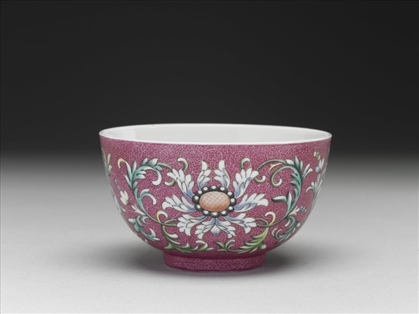 敞口,弧壁,矮圈足。器內壁為白地,光素無紋,外壁紫紅地上錐剔卷草紋,口沿與足底留白一周,隙地加飾彩繪折枝洋花三朵,兩側飾對稱綠葉,枝葉捲曲柔軟,錯落有致。器底為白地,以青花書「大清乾隆年製」六字三行篆款,青花色澤淺淡。於錦地隙處繪飾花紋之技法又稱為「錦上添花」,為乾隆朝琺瑯彩瓷常見之技法。