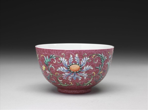 敞口,弧壁,矮圈足。器內壁為白地,光素無紋,外壁紫紅地上錐剔卷草紋,口沿與足底留白一周,隙地加飾彩繪折枝洋花三朵,兩側飾對稱綠葉,枝葉捲曲柔軟,錯落有致。器底為白地,以青花書「大清乾隆年製」六字三行篆款,青花色澤淺淡。於錦地隙處繪飾花紋之技法又稱為「錦上添花」,為乾隆朝琺瑯彩瓷常見之技法。