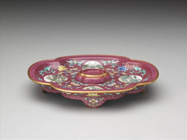 琺瑯彩紅錦地開光山水圖托盤