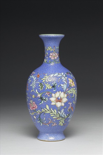 撇口,細頸,斜肩,圓弧腹,撇足。通體為藍地錦上添花紋,藍地上剔錐細密如絲的卷草錦紋,餘隙分二段裝飾,上段頸部洋花一圈,下段瓶身則畫轉枝洋蓮—銀蓮花與洋菊花葉紋。胎體輕薄,口足均描細金邊一道,器頸及底均施湖綠釉,底心藍料書「乾隆年製」四字二行篆款,外加雙圈。這類瓶制,清宮稱為「觀音瓶」,頸有細長及略短者。