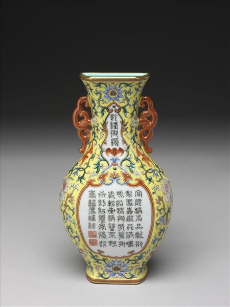 均侈口,短頸,碩腹,平背,矮圈足。頸飾雙耳,足有二圓孔。胎質稍厚,外面黃釉地,彩畫各種花卉,加飾蝙蝠五隻。瓶面兩開光,上面篆書「乾隆御題」四字。下面篆書題詩:「官汝稱名品,新瓶製更嘉,隨行供嘯詠,沿路擷芳華,掛處輕軒稱,簪來野卉斜,紅塵安得近,香籟度帷紗。」硃紅描繪「乾隆宸翰」「惟精惟一」二印。器內及底均施淺綠色釉。底均有青花書「大清乾隆年製」六篆字橫款。