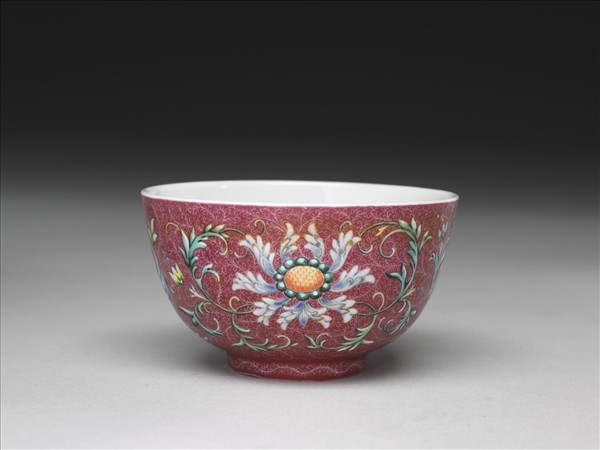 敞口,弧壁,矮圈足。器內壁為白地,光素無紋,外壁紫紅地上錐剔卷草紋,口沿與足底留白一周,隙地加飾彩繪折枝洋花三朵,兩側飾對稱綠葉,枝葉捲曲柔軟,錯落有致。器底為白地,以青花書「大清乾隆年製」六字三行篆款,青花色澤淺淡。於錦地隙處繪飾花紋之技法又稱為「錦上添花」,為乾隆朝琺瑯彩瓷常見之技法。