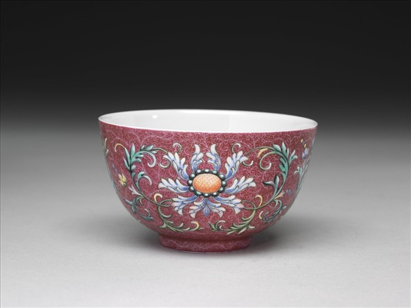 敞口,弧壁,矮圈足。器內壁為白地,光素無紋,外壁紫紅地上錐剔卷草紋,口沿與足底留白一周,隙地加飾彩繪折枝洋花三朵,兩側飾對稱綠葉,枝葉捲曲柔軟,錯落有致。器底為白地,以青花書「大清乾隆年製」六字三行篆款,青花色澤淺淡。於錦地隙處繪飾花紋之技法又稱為「錦上添花」,為乾隆朝琺瑯彩瓷常見之技法。