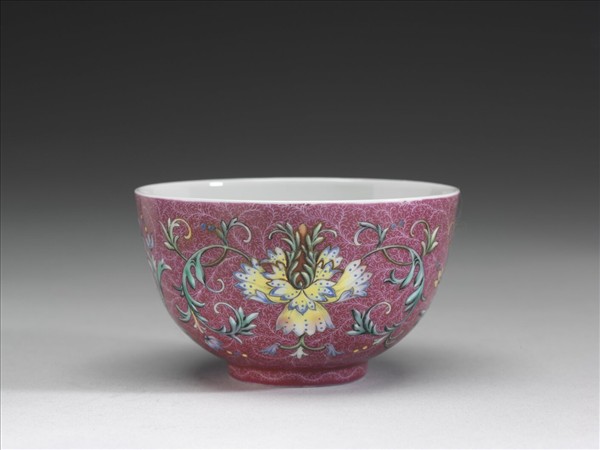 敞口,弧壁,矮圈足。器內壁為白地,光素無紋,外壁紫紅地上錐剔卷草紋,口沿與足底留白一周,隙地加飾彩繪折枝洋花三朵,兩側飾對稱綠葉,枝葉捲曲柔軟,錯落有致。器底為白地,以青花書「大清乾隆年製」六字三行篆款,青花色澤淺淡。於錦地隙處繪飾花紋之技法又稱為「錦上添花」,為乾隆朝琺瑯彩瓷常見之技法。