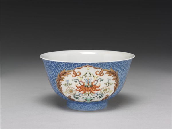 碗,撇口,深弧壁,圈足。全器以釉上洋彩為飾。外壁飾藍地三開光,開光以葉紋與如意紋交纏成框飾,框內繪橘紅色圖案式花卉(或稱番蓮),並旁襯粉色菊花。開光外隙地施藍彩,錐剔卍字四瓣花紋錦地。圈足壁作藍地剔刻卷草紋。器內底部彩繪折枝花果二枝。外底書「大清乾隆年製」三行青花篆款。