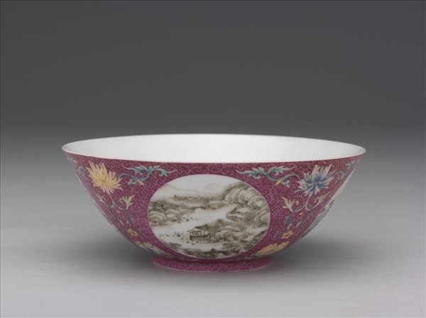 碗,侈口,弧壁,圈足。全器以釉上洋彩為飾。外壁飾四圓形開光,內部分別以墨彩及彩繪畫四季山水,山水之中或有人物、舟船、樓閣;餘外壁施紫紅彩,彩釉鉤繪圖案式花卉,隙地錐剔鳳尾形卷草錦地紋。器內白地光素無紋。外底書「大清乾隆年製」三行青花篆款。