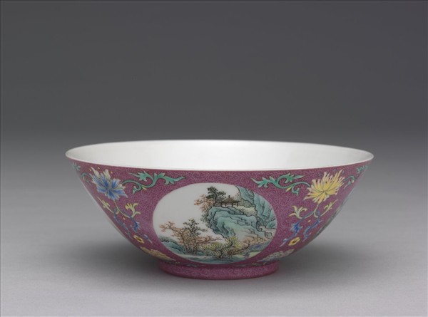 碗,侈口,弧壁,圈足。全器以釉上洋彩為飾。外壁飾四圓形開光,內部分別以墨彩及彩繪畫四季山水,山水之中或有人物、舟船、亭臺樓閣;餘外壁施紫紅彩,彩釉鉤繪圖案式花卉,隙地錐剔鳳尾形卷草錦地紋。器內白地光素無紋。外底書「大清乾隆年製」三行青花篆款。