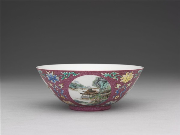 琺瑯彩紅錦地開光四季山水圖碗