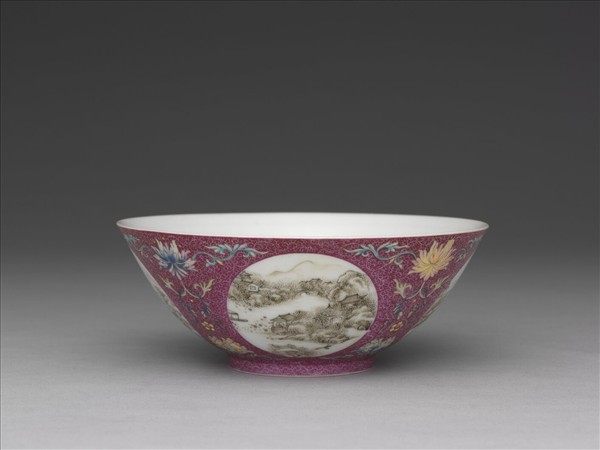琺瑯彩紅錦地開光四季山水圖碗