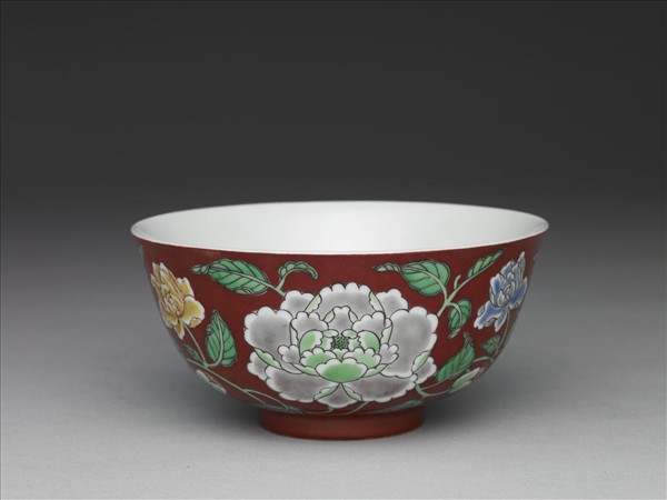 這件碗侈口、深腹、矮圈足。器內平素無紋,外壁以紅釉為地,彩繪紫、藍、黃三色牡丹,大花之間並間飾有藍、紅、菊花各式花卉以及纏枝綠葉。器底帶「雍正御製」二行青花楷書雙方框款。 透過顯微放大五十倍的觀察,紅花與紅地色調偏橘,暗沉無玻璃質感,屬景德鎮傳統礬紅彩的應用。