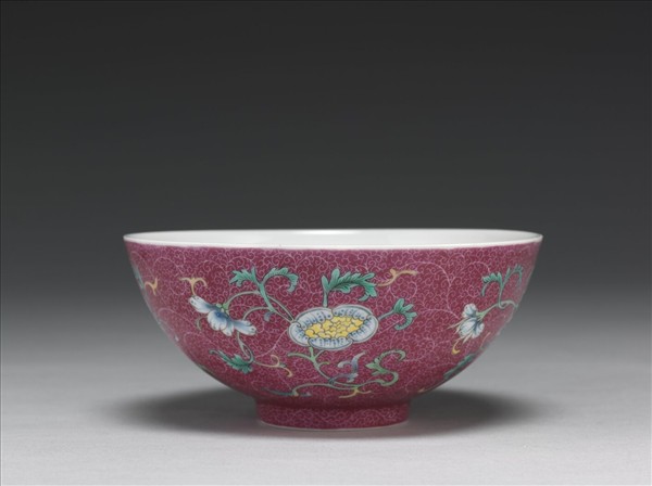 碗,侈口,深弧壁,圈足。全器以釉上洋彩為飾。外壁施紫紅彩,彩釉鉤繪四組圖案式花卉,外壁隙地及圈足錐剔鳳尾形卷草錦地紋。內底彩繪折枝桃、石榴及單顆佛手的三多紋樣。外底書「大清乾隆年製」三行青花篆款。