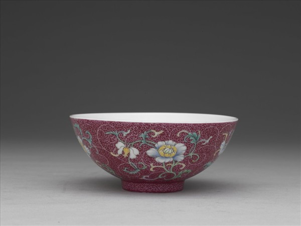 碗,侈口,深弧壁,圈足。全器以釉上洋彩為飾。外壁施紫紅彩,彩釉鉤繪四組圖案式花卉,外壁隙地及圈足錐剔鳳尾形卷草錦地紋。內底彩繪折枝桃、石榴及單顆佛手的三多紋樣。外底書「大清乾隆年製」三行青花篆款。