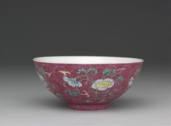 碗,侈口,深弧壁,圈足。全器以釉上洋彩為飾。外壁施紫紅彩,彩釉鉤繪四組圖案式花卉,外壁隙地及圈足錐剔鳳尾形卷草錦地紋。內底彩繪折枝桃、石榴及單顆佛手的三多紋樣。外底書「大清乾隆年製」三行青花篆款。