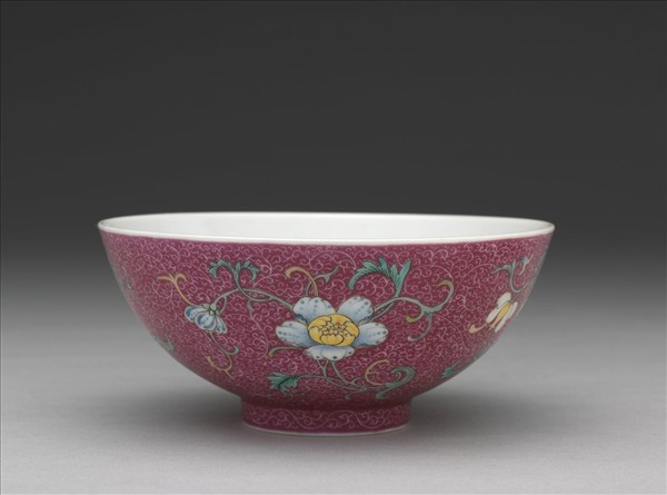 碗,侈口,深弧壁,圈足。全器以釉上洋彩為飾。外壁施紫紅彩,彩釉鉤繪四組圖案式花卉,外壁隙地及圈足錐剔鳳尾形卷草錦地紋。內底彩繪折枝桃、石榴及單顆佛手的三多紋樣。外底書「大清乾隆年製」三行青花篆款。