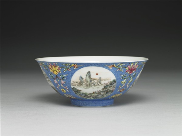 洋彩藍地團花山水圖碗