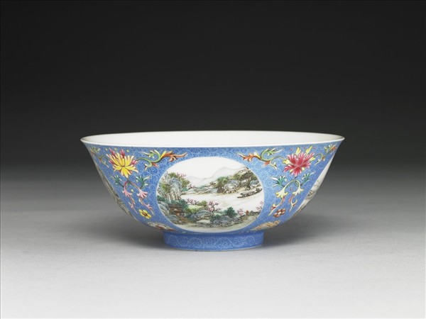 洋彩藍地團花山水圖碗