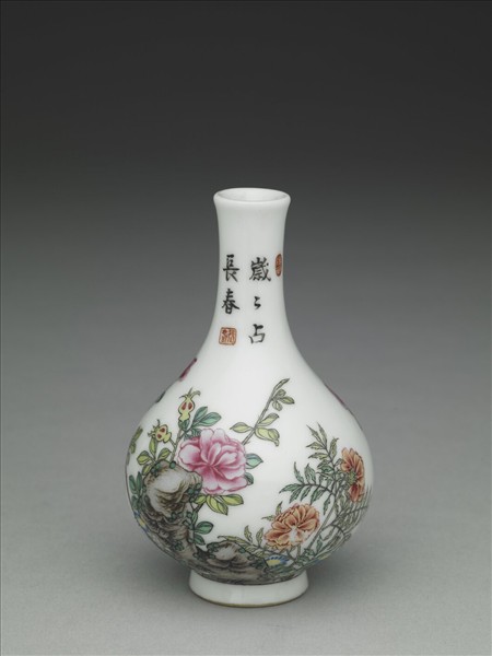 瓶,斂口,長頸,梨形腹,矮圈足。薄胎白釉,瓶腹彩畫桃紅月季、紅芙蓉花,加飾湖石、野菊。頸上墨彩題:「歲歲占長春」句,首尾硃紅描繪「佳麗」及「長春」二印。外底心書「乾隆年製」雙行藍料楷書款。