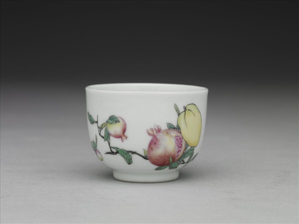 斂口杯,深壁,底邊呈弧形,矮圈足。薄胎白釉,外壁彩畫石榴、蘋果、木瓜及桃。一面有墨彩題句:「丹實瑤光接,仙根玉露滋。」首尾紅料描繪「佳麗」及「旭」、「映」三印。內面純白,樸素無紋飾。外底心書「乾隆年製」雙行藍料楷書款。