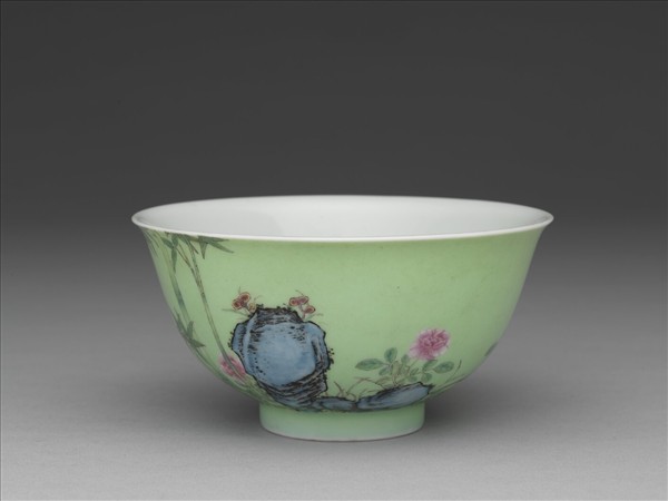 侈口碗,深弧壁,矮圈足。胎質較薄。內壁施白釉,樸素無紋。外壁淺綠釉地,彩畫靈芝、月季、竹、石及野菊。一面有墨彩題句:「朝朝籠麗月,歲歲占長春。」首尾以紅料描繪「佳麗」及「旭映」、「君子」三印。外底心書「雍正年製」雙行雙方框藍料宋體字款。