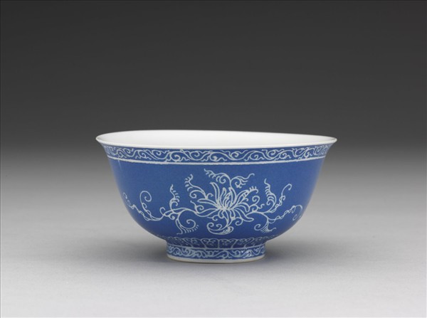碗侈口窄唇,深壁,矮圈足,外壁施藍釉,釉面以針狀工具逐一剔除底釉,描畫出折枝花卉兩朵,上下加飾卷雲紋兩圈,碗內罩白釉,底心畫折枝石竹花卉,底以藍料書「乾隆年製」四字宋體款。