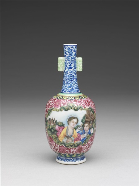 此器小巧,斂口、長頸,頸側貼貫耳,長腹、矮圈足。胎質稍厚,腹部兩面開光,彩畫西洋風景與聖母子圖像。開光外面的隙地,以紅、藍、綠、黃等各色彩釉畫卷枝、如意雲及纏枝花卉,瓶面雖窄,卻滿填花紋,形如緻密華麗的錦緞。底以藍料書「乾隆年製」四字宋體款。 十八世紀的中國與世界往來密切,清宮之內遊走著許多來自歐洲,且各備特殊才藝的傳教士,他們參與宮廷藝術的研發與設計,同時也引進西方的文化,影響西洋裝飾題材的出現。如西洋仕女頭上的白色光圈提示其即為聖母,而向前獻花的小孩為聖子。聖母子圖像及西洋風景出現於乾隆官窯中,具體呈現此時期中西藝術交流的情形。外底心書「乾隆年製」雙行雙方框藍料楷書款。
