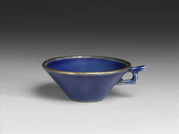 兩件一組的杯盤,杯器身作漏斗狀,一側有丁字形條狀折角單把向上斜出;盤為口沿外折,底部平坦呈折沿淺壁。杯、盤通體施罩靛藍色霽青釉,釉表殘留金銀描繪的筆膠痕跡;杯與盤無圈足,底平而無釉,塗有黃褐色護胎汁,口沿均鑲有一圈銀稜釦。霽青釉指釉料富含氧化鈷而呈藍色,施於胎體後高溫燒成,色澤靛青幽謐如藍寶石,為元代新興產品,並不多見,有青色中留白花、印花或描金彩等裝飾。 本件單把杯,金彩遺痕清晰可辨,杯外壁殘留有繞壁相連的梅花紋,與河北保定永華南路窖藏霽青碗、浙江杭州朝暉路窖藏金彩爵杯的金彩紋飾相近;又因單把丁字形和安徽省合肥市元代窖藏所出銀杯相似,透過該一窖藏金銀器有「至順癸酉」刻銘,而可間接窺見可能的產燒時間。杯內口沿與內底的菱格紋、幾何十二星芒團花紋隱約帶有伊斯蘭風格趣味;折沿盤內金彩脫落的釉表,隱約可見相對的雙龍與火珠紋,瘦長的雙龍分據盤內面的上下方,龍紋特徵相似於其它元代作品。類似的單把小杯盞與折沿盤並陳出土的情形,也多見於元代其它瓷窯產品中,似也說明這種有盤有盞、成套組合的酒器是元人習慣的使用形式。(故瓷17370、故瓷17371)