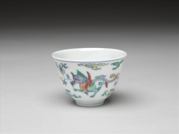 侈口窄唇,深壁,矮圈足。外面彩畫夔龍二條,各銜番蓮花一枝,上下加飾青花朵雲,口足分飾青線二道。內面純白,樸素無紋飾。底均有青花書「大明成化年製」六楷字款,外加雙方框。