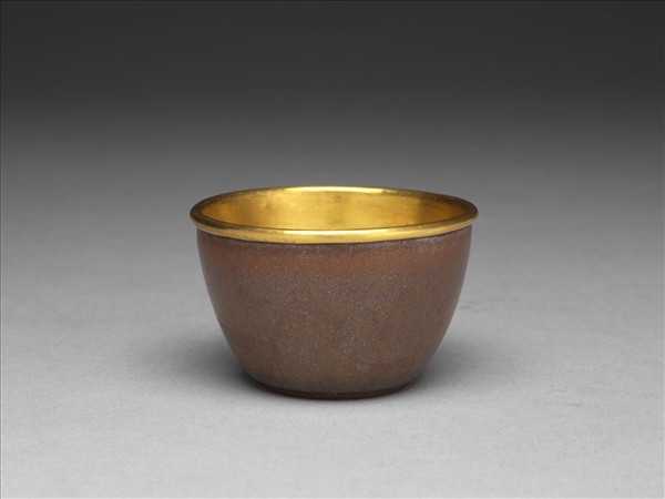 敞口,深腹,平底。五件一組,由大至小疊合成套,故稱套杯。大杯口徑8.7公分;小杯為5.7公分。胎地為宜興紫砂,內壁、底部不上釉,外壁施紫金釉,燒成後,再於杯內套金片至杯口。紫金釉色襯托杯內金底,典雅不俗,杯外底顯見紫砂胎地,顆粒略粗,胎土含黑黃砂粒。杯無款識,然由胎釉、形制比對,似為乾隆時期所製。此套杯小巧精緻,由於胎地是紫砂胎泥,推測應該也是清宮用來飲茶的茶杯。紫金釉又名醬釉、柿色釉,是一種以鐵為著色劑的高溫釉,釉色與芝麻醬色非常接近。