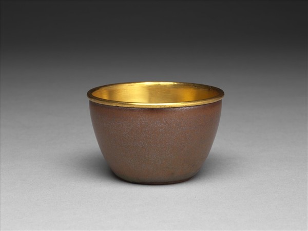 敞口,深腹,平底。五件一組,由大至小疊合成套,故稱套杯。大杯口徑8.7公分;小杯為5.9公分。胎地為宜興紫砂,內壁、底部不上釉,外壁施紫金釉,燒成後,再於杯內套金片至杯口。紫金釉色襯托杯內金底,典雅不俗,杯外底顯見紫砂胎地,顆粒略粗,胎土含黑黃砂粒。杯無款識,然由胎釉、形制比對,似為乾隆時期所製。此套杯小巧精緻,由於胎地是紫砂胎泥,推測應該也是清宮用來飲茶的茶杯。紫金釉又名醬釉、柿色釉,是一種以鐵為著色劑的高溫釉,釉色與芝麻醬色非常接近。