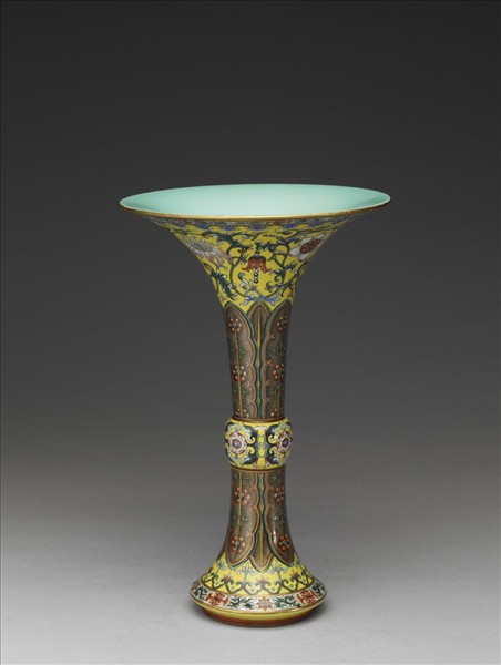 形仿銅觚造形,喇叭形口,長頸,小鼓腹,脛部外撇,平底,矮圈足。全器施琺瑯彩,器內與底皆作湖綠色,外表於黃地上繪纏枝番蓮花、蕉葉等幾何式花卉圖案。口沿、腹部及底足各加描金線四道。底心藍料書雙方框「乾隆年製」二行篆款。