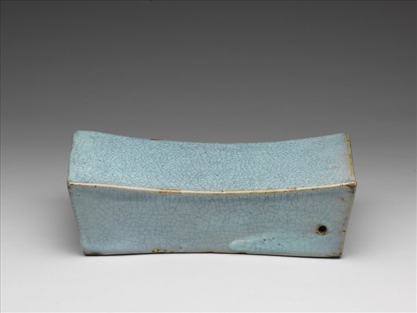 枕作長方形,枕身所在的面中心略凹,前後壁成弧形,兩端平直,前璧右下角開一小孔,器內中空,胎骨厚重。通體罩施天藍色釉,釉色泛灰,釉表面開藍色細紋片,枕面周圍成米黃邊,全器滿釉支燒,於左側留下四個支燒痕,底刻清乾隆甲申春(1764)御題詩一首,並刻有「乾」、「隆」二印,底緣傷缺,露出灰白色胎。