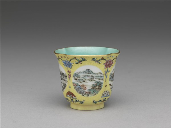 杯撇口,深腹,圈足。器外壁及圈足均為黃地錐剔鳳尾形卷草錦地紋,餘隙二圓形開光內分別以墨彩及彩繪畫四季山水,開光之間鉤繪圖案式洋花。口足描金,杯內及外底施湖綠釉,外底心白地框內青花書「乾隆年製」四字二行篆款。