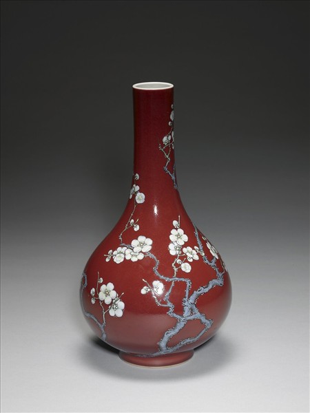 膽瓶形制,外壁通體施霽紅釉,上繪白梅二株,老幹橫斜,枝上梅花盛放、半開、含苞各具姿態。白梅花萼以黃料敷染,花瓣略染胭脂紅、綠色琺瑯料,白梅均帶開片紋,灰紫梅幹點染青苔,苔點為綠釉上加染白料。胎體勻厚,內口沿及底均見拉坯遺痕。霽紅釉內有紅、橘交織的流淌紋,兼有大小透明氣泡。器內及底均施透明白釉,底心青花書「大清乾隆年製」六字三行篆款。