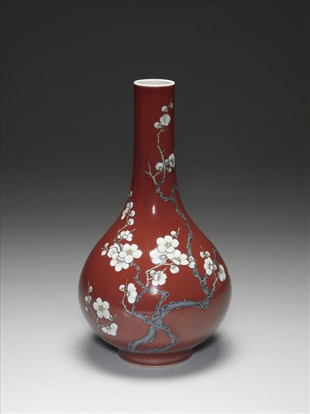 膽瓶形制,外壁通體施霽紅釉,上繪白梅二株,老幹橫斜,枝上梅花盛放、半開、含苞各具姿態。白梅花萼以黃料敷染,花瓣略染胭脂紅、綠色琺瑯料,白梅均帶開片紋,灰紫梅幹點染青苔,苔點為綠釉上加染白料。胎體勻厚,內口沿及底均見拉坯遺痕。霽紅釉內有紅、橘交織的流淌紋,兼有大小透明氣泡。器內及底均施透明白釉,底心青花書「大清乾隆年製」六字三行篆款。