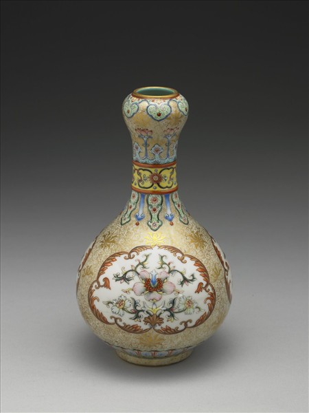 瓶作蒜頭口,束頸,碩腹,圈足。通體除三開光內均以金彩卷草蓮紋為地,口沿下畫如意雲紋,頸間環狀圈內畫交纏如意圈一道,上下則各飾六朵直立蓮花及長形如意雲紋。開光白地上各畫單瓣銀蓮花,蕊心雌蕊突出,底邊蓮瓣一圈。口足均描金彩。頸內及底均施湖綠釉,底心藍料書「乾隆年製」二行四字篆款。全器以描金卷草錦紋為地,餘隙添繪各類紋飾,此亦為錦上添花的一種,華麗絢爛,表現了乾隆朝琺瑯彩瓷的特有風格。