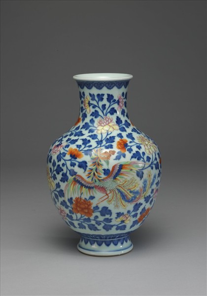 瓶,侈口窄唇,短頸碩腹,矮圈足。厚胎白釉,器外壁粉彩畫鳳凰一對及牡丹花紋,白釉隙地以青花畫纏枝牡丹花葉,外壁口沿、底邊近圈足處加飾青花如意雲紋、變形蓮瓣紋及蕉葉紋等三道。外底足緣一週未上釉露胎,外底心有「大清乾隆年製」三行青花篆書款。