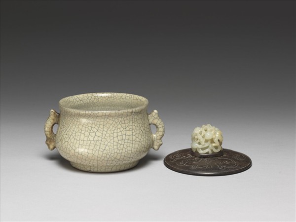 項元汴(1525-1590),字子京,是十六世紀活躍於江南地區的大藏家。生前曾建置「天籟閣」做為藏物處所,也多次邀請文震亨祖父文彭和叔祖父文嘉一起鑑別畫作。他不惜重金獵求文物的故事與到手的價格,也公佈在不同的文本和畫作上。魚耳爐隨附有木蓋,內面戳刻「子京」和「項元汴印」兩枚印章,揭露這個瓷爐曾經收藏在項元汴家,作為他珍愛的長物。(引自「小時代的日常 - 一個十七世紀的生活提案」展覽說明)